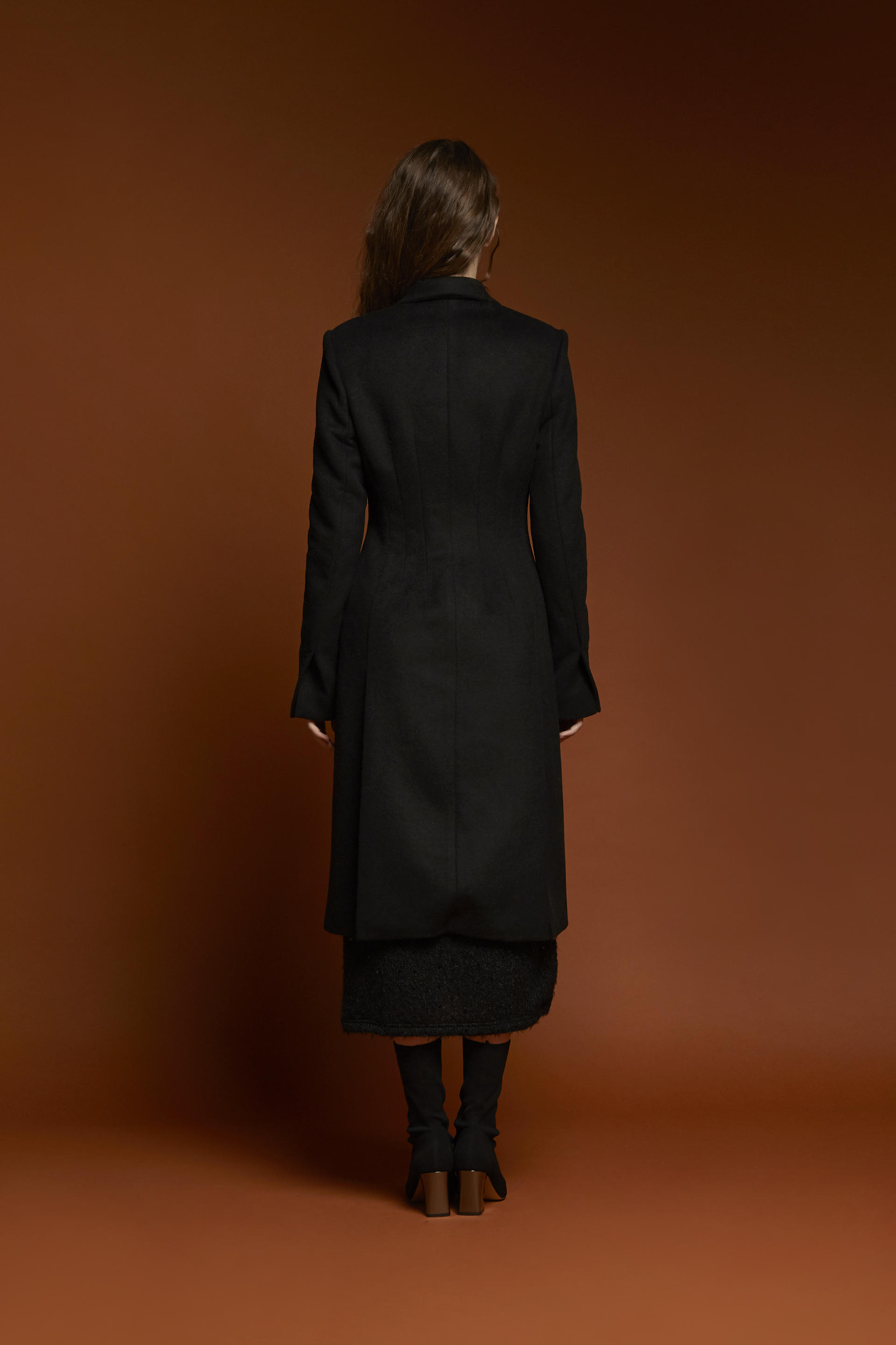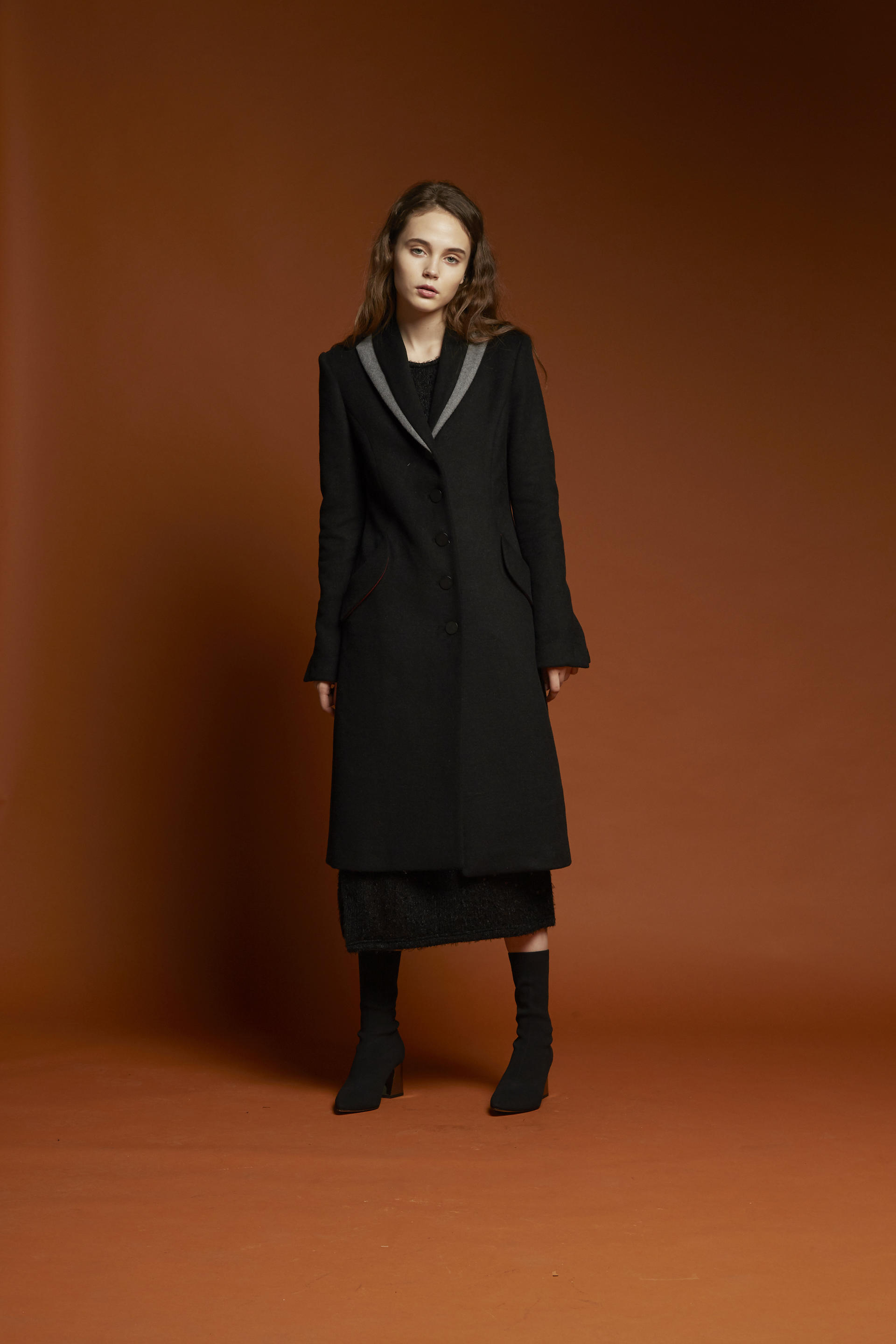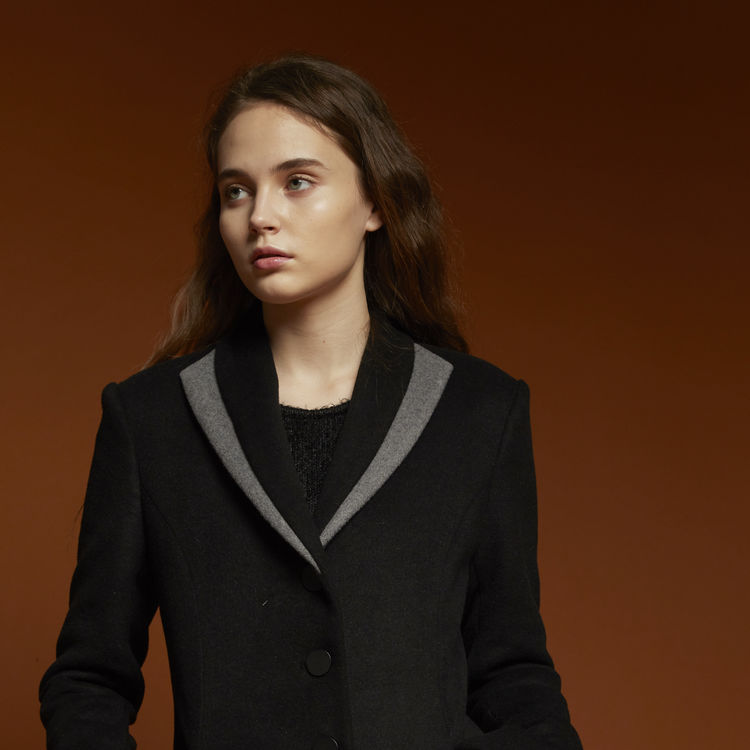 잘록하게 들어간 허리라인이 돋보이는 코트입니다.