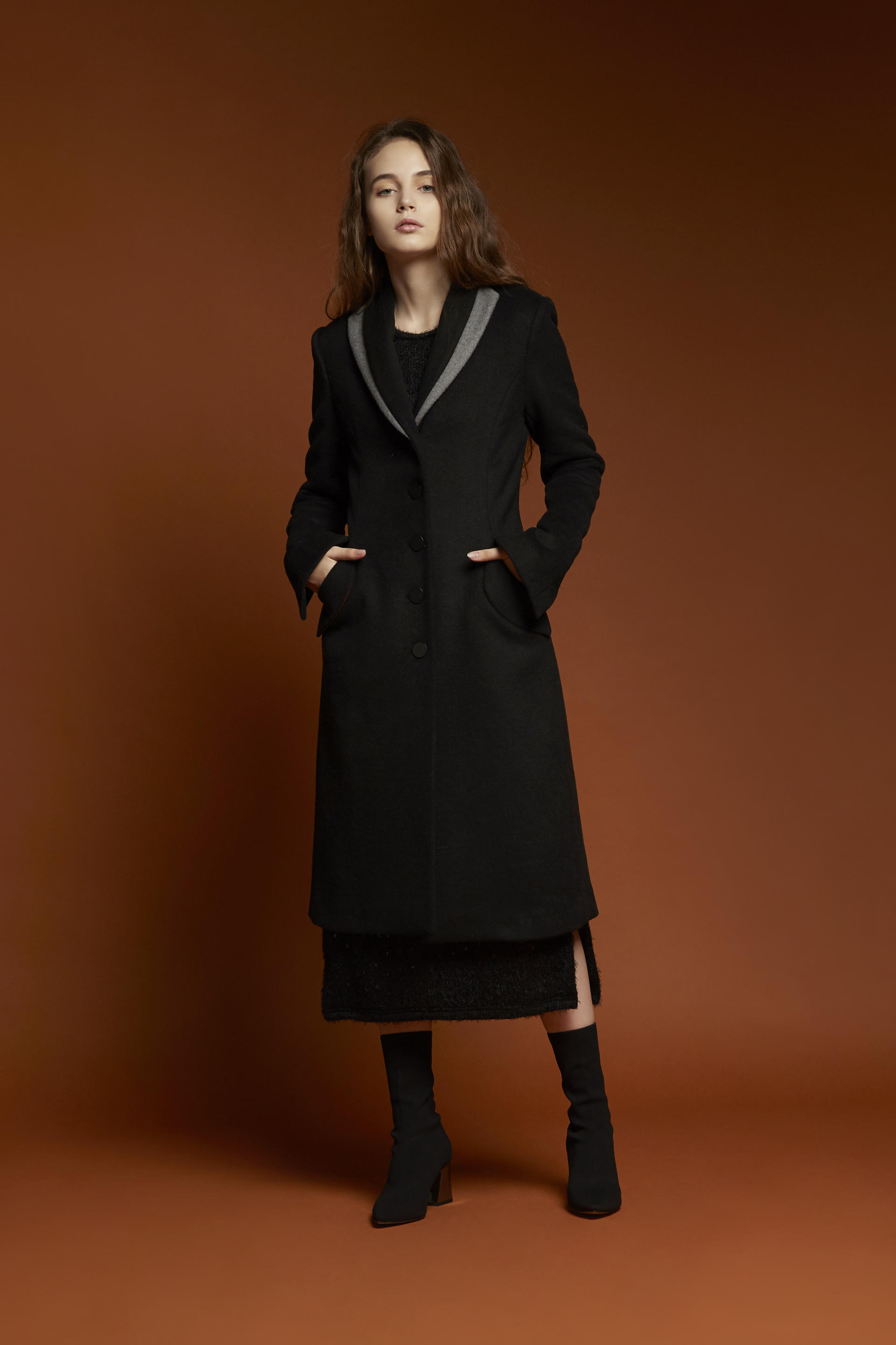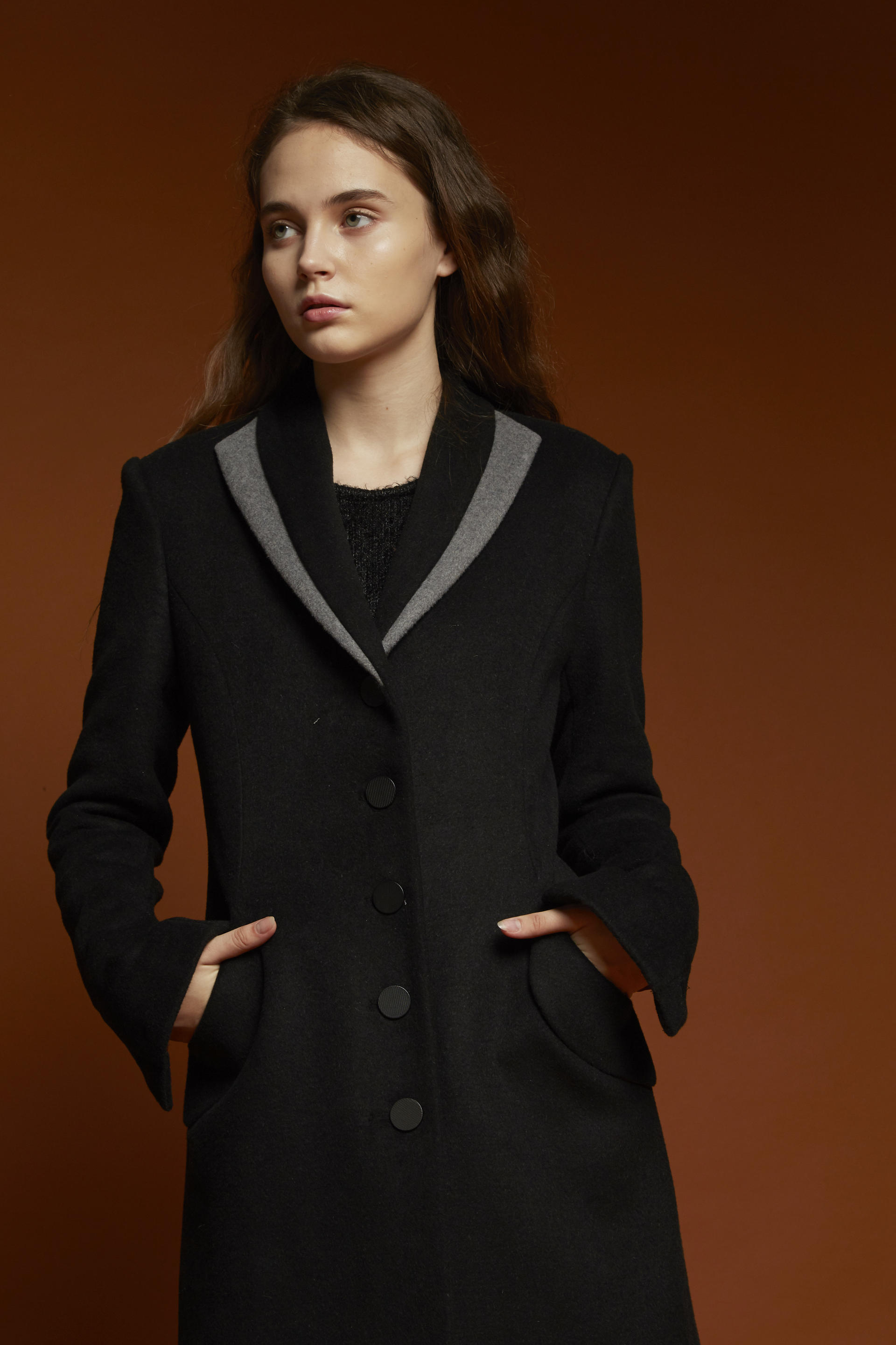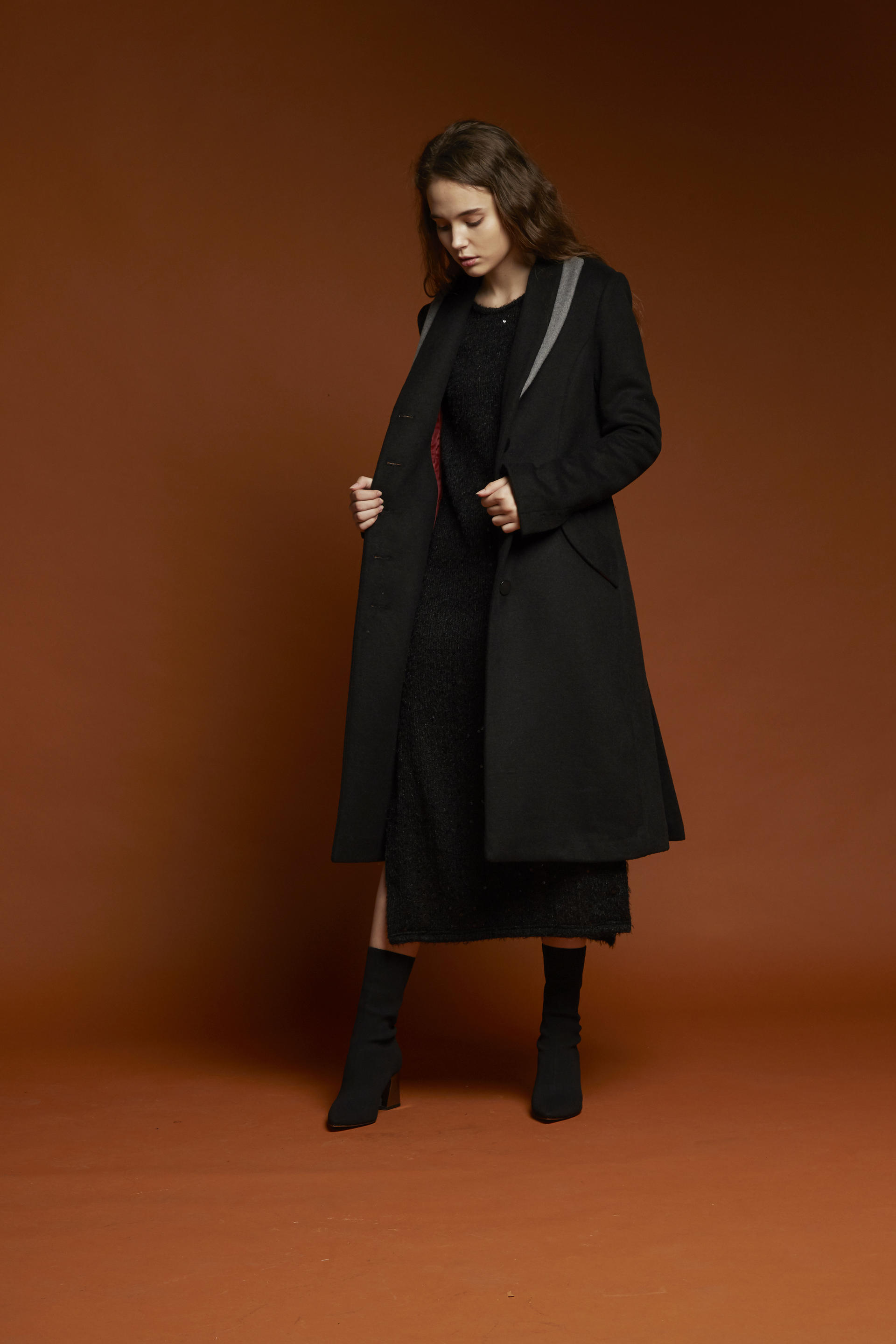 잘록하게 들어간 허리라인이 돋보이는 코트입니다.